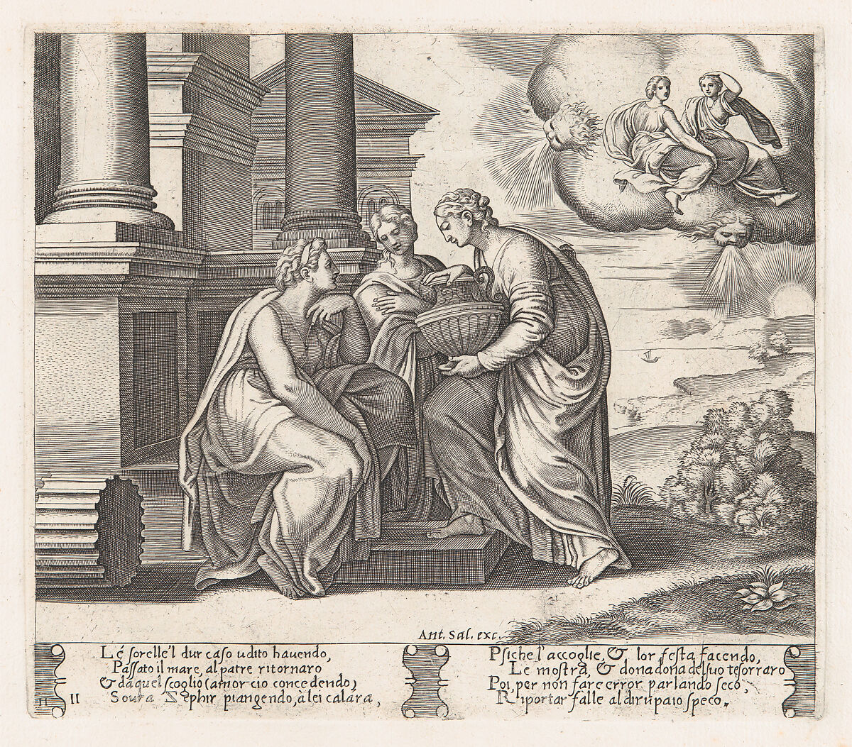 - Title: Plate 11: Psyche offering presents to her sisters who also appear on the clouds at upper right, from "The Story of Cupid and Psyche as told by Apuleius"