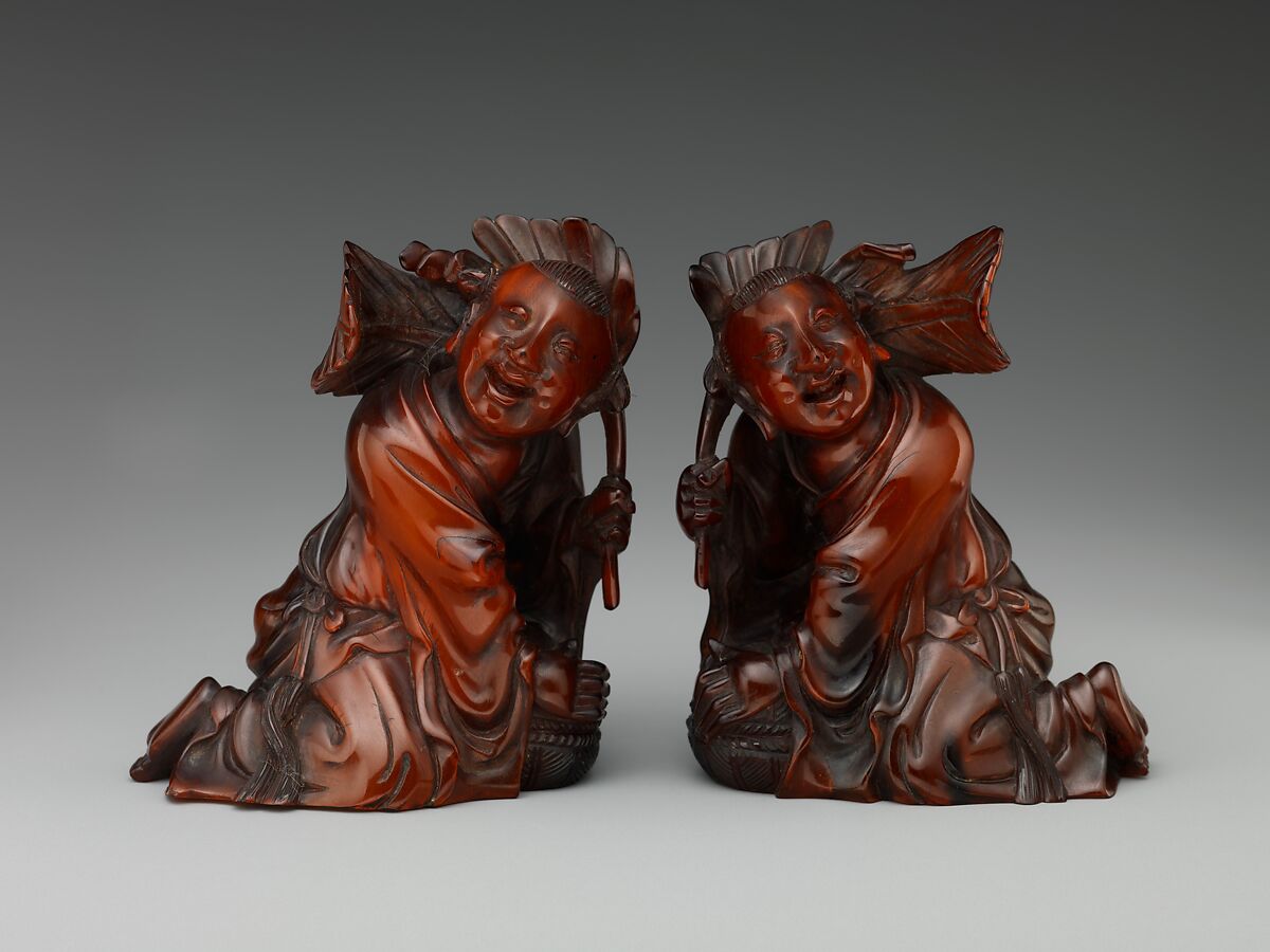 Two boys holding a lotus or leaf and a box are popular New Year’s images symbolic of harmony and union. Known as the hehe twins, in reference to the characters for these virtues both of which are read he, this pair is also thought to have been inspired by the legendary Tang dynasty (618–907) Buddhist monks Hanshan and Shide.