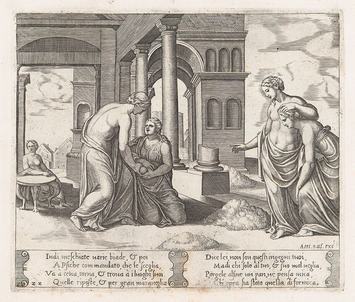 - Title: Plate 22: Venus standing at right ordering Psyche to sort a pile of grain, at left the same pair hold a loaf of bread, from "The Story of Cupid and Psyche as told by Apuleius"