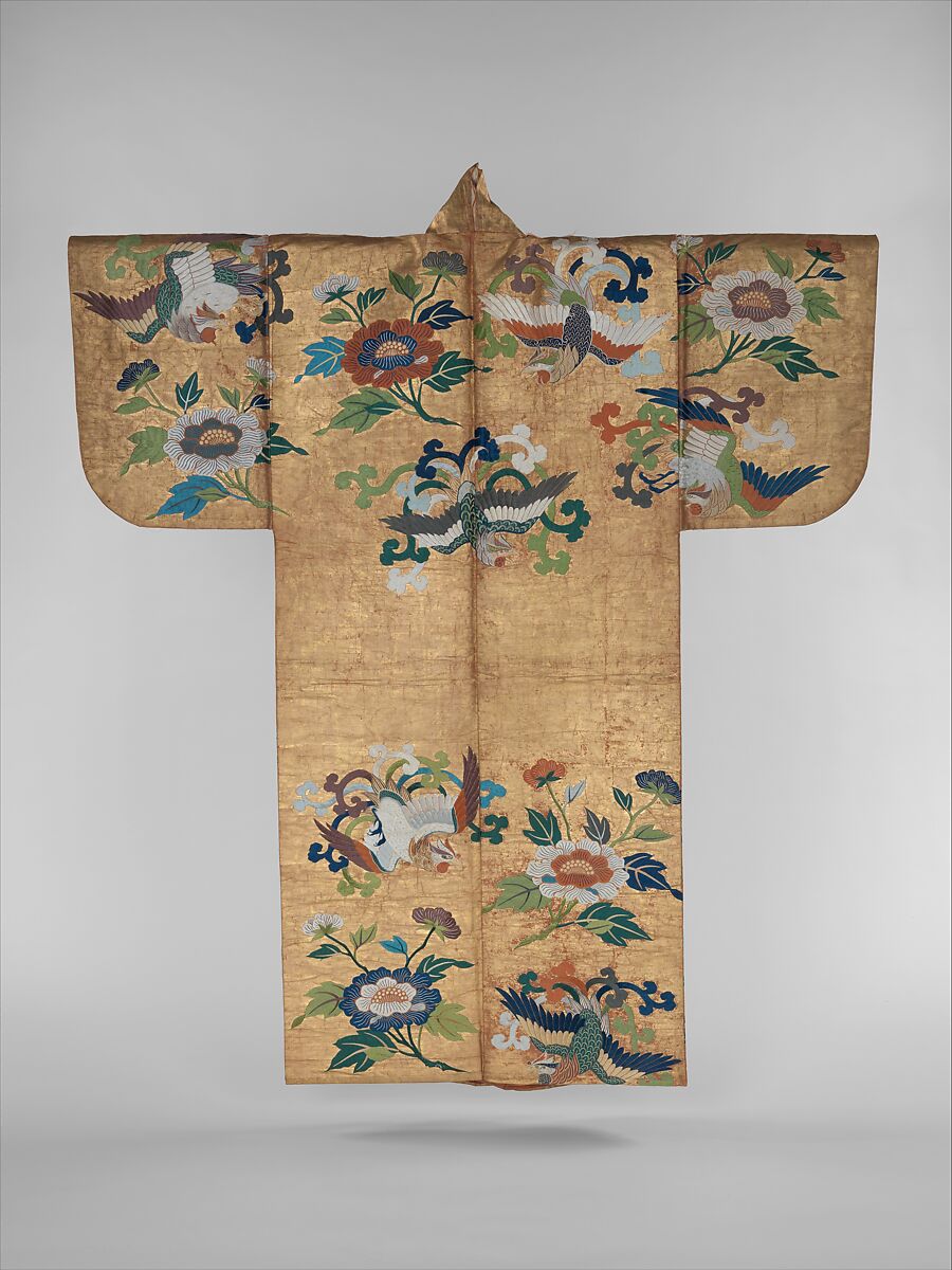 Nuihaku robes are elegant Noh costumes with very fine embroidery applied on a metal-leaf ground. Mainly used in plays featuring young female protagonists, they are worn around the waist beneath sumptuous outer robes. In the Momoyama (1573–1615) and early Edo periods, before outer robes became lavish garments, nuihaku were the most splendid part of the costume and were themselves used as outer robes. This exquisite example in the “phoenix flying through peonies” pattern is embellished with phoenixes, auspicious symbols of prosperity, fidelity, and good deeds as well as with peonies, the “king of flowers,” representing good fortune and honor. The composition is based on a design created by Maruyama Ōkyo (1733–1795), a prolific Kyoto-based painter whose style incorporated Western naturalism into East Asian painting traditions.