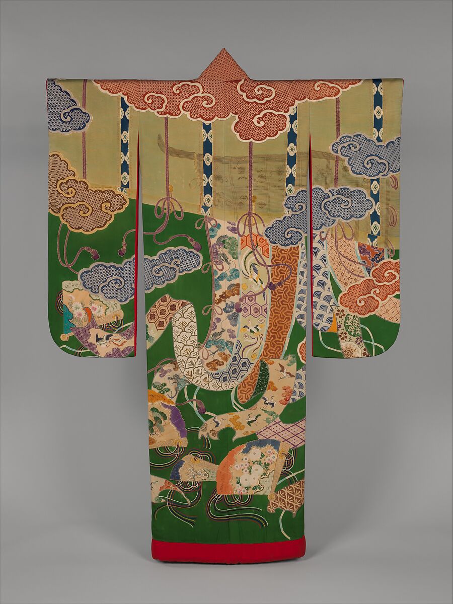 The stylized clouds, bamboo blinds (misu), minutely decorated curtain screens (kichō), and elaborate fans adorned with colorful strings (hiōgi) evoke the golden age of the Heian period (794–1185) court. This type of decorative pattern became fashionable during the second half of the Edo period (1615–1868) among wealthy chōnin ladies. It continued to be popular in an altered form into the early twentieth century, with vivid green becoming a favored ground color from the 1910s to 1930s, although there are examples in red and black. The over robe is covered in auspicious motifs. Among the skillfully rendered details are the translucency of the bamboo blinds, the ornamental patterns of the curtain screen, and the individual designs of the fans at the bottom of the robe, which emulate in silk, dyes, and gold leaf the decoration found on paper fans.