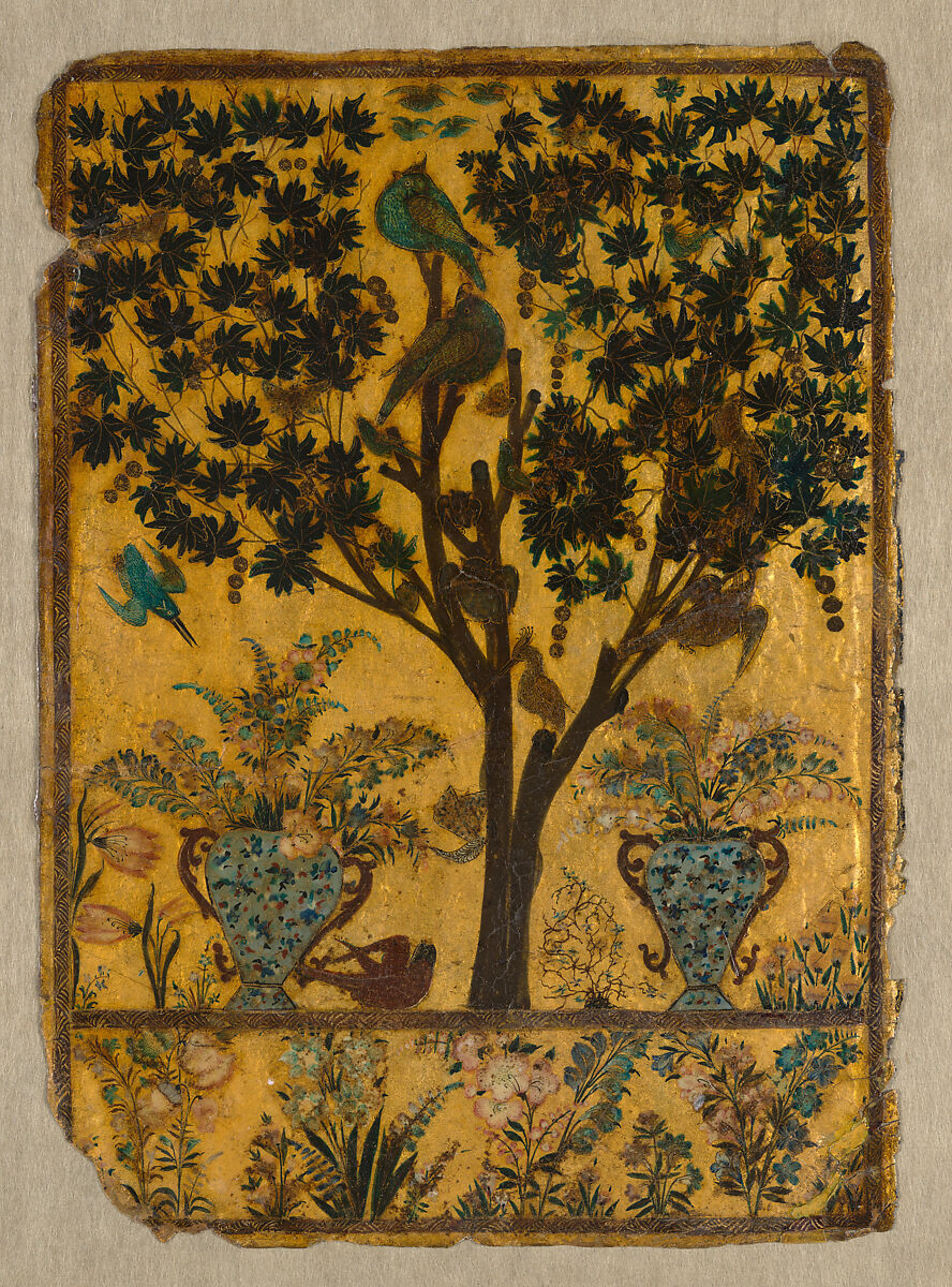 This book cover decorated with opulent and fantastical flowering scenes on lacquer was made for a manuscript or album that has since been disseminated. Depictions of flowering vases are a known design from the Deccan, and the fertile trees are oftentimes interpreted as "Tree of Life" motifs. The unusually large scale of the birds and insects in the scene is characteristic of the whimsical creativity of artists from the Deccan region of India.