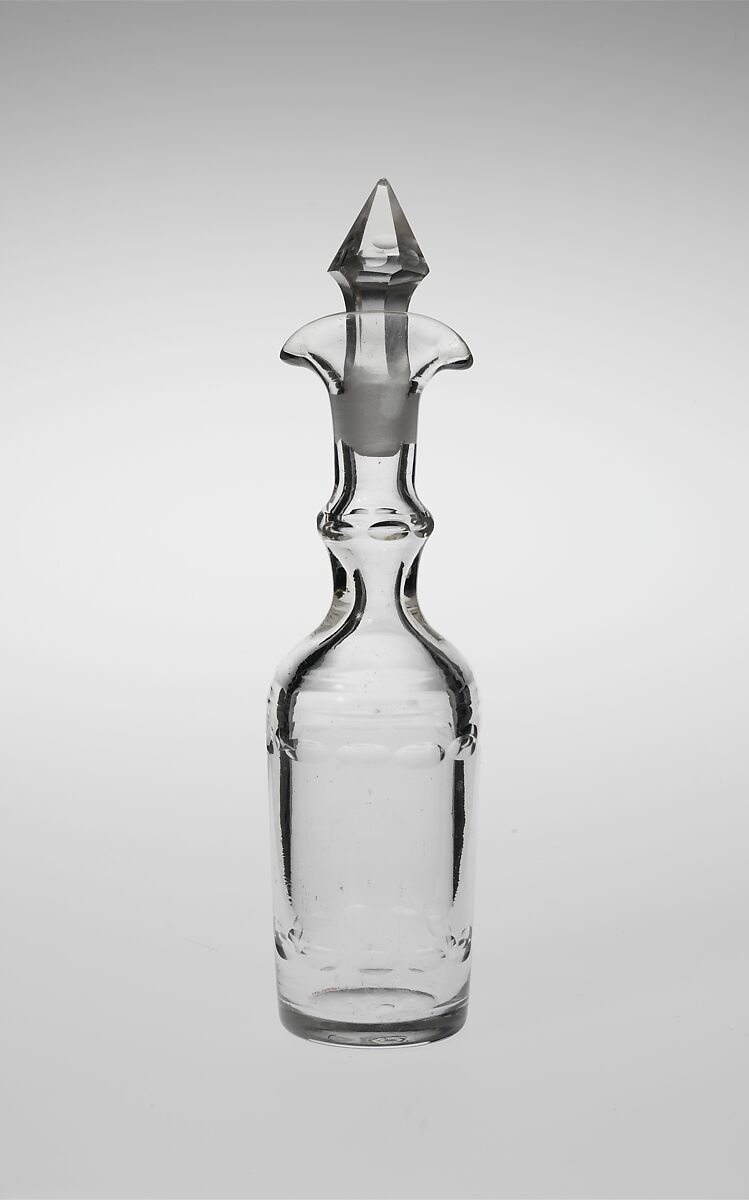 This cruet bottle is one of a set of six, 1972.225.2–.7, that belongs with the silver cruet stand, 1972.225.1. Although the stand is of American make, these bottles were probably imported from England or Ireland.