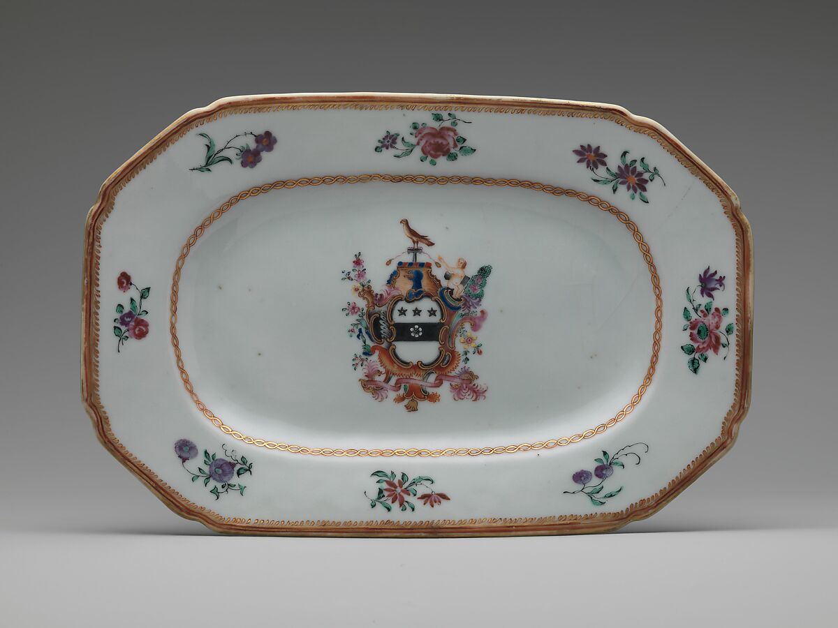 This object belongs to a large dinner service (10.149.1–.248) bearing the Townley family coat-of-arms. The service, probably ordered by Justice Samuel Chase (1741–1811) of Annapolis, Maryland, displays the enamel-painted arms of Margaret Townley, Chase's aunt.