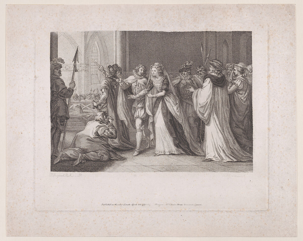 This print reproduces one of a set of designs commissioned from Rigaud in 1789 by the 4th Earl of Abingdon to complement a musical piece he had written on Mary's final hours and death. Rigaud's drawing for the print was exhibited at the Royal Academy, London in 1791 and is now unlocated.