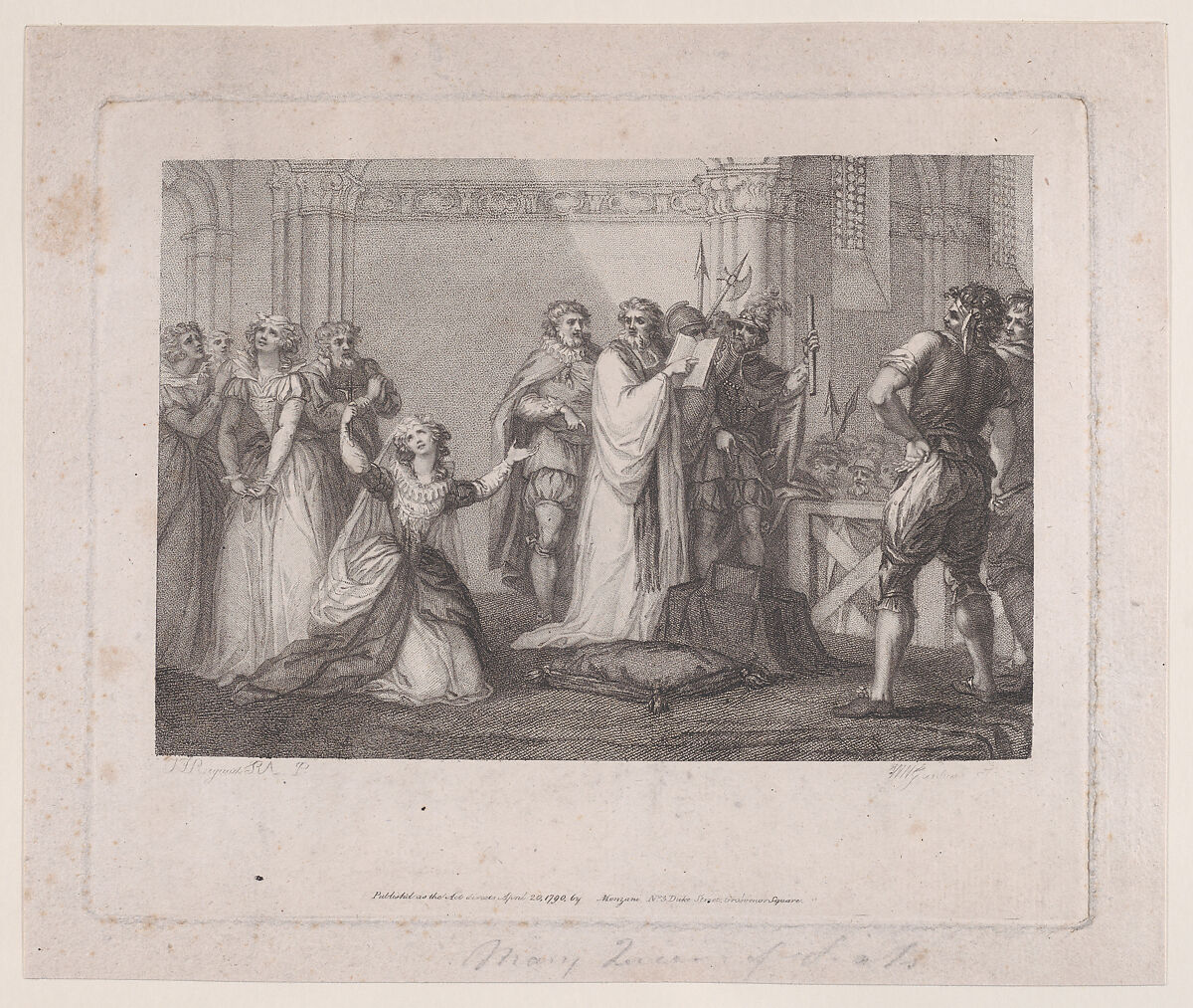 This print reproduces one of a set of designs commissioned from Rigaud in 1789 by the 4th Early of Abingdon to complement a musical piece he had written on Mary's final hours and death. Rigaud's drawing for the print was exhibited at the Royal Academy, London in 1791 and is now unlocated.