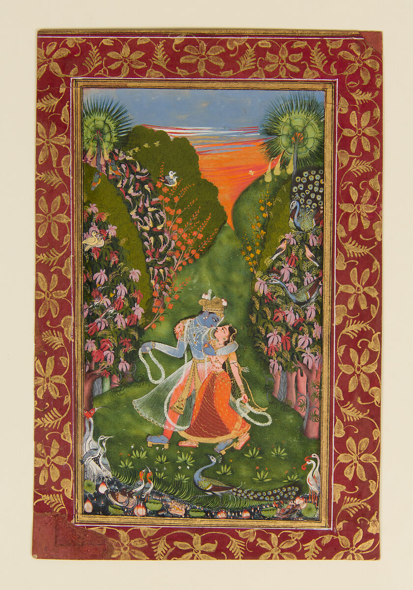 Krishna and Radha gaze into each other’s eyes during a sunset walk. Their love is expressed by the multitude of birds, the flowering trees, and the intertwining of their bodies and garments. This quintessential Indian idea—that nature echoes human passion—is beautifully manifested in this work by a master who has successfully translated emotion into visual delight. The personification of nobles as the lovers Krishna and Radha was a popular pictorial theme in Kota and other Rajasthani courts. The subject relates to the poetry of the time.