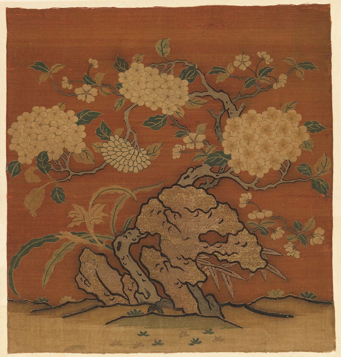 This tapestry picture features a contrast between the boldly decorative garden rock, which was woven in gold with black outlines, and the more delicately realized hydrangea and other flowers, woven in various hues of silk that have faded with time. A close look reveals that the leaves are outlined in gold thread.