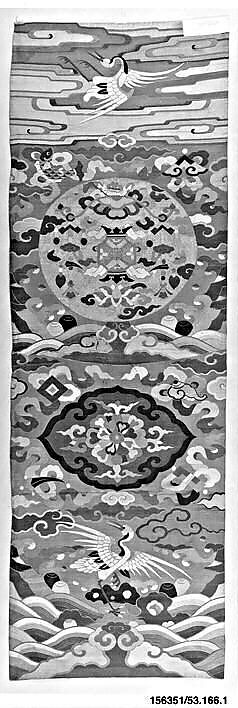 This chair strip was appropriate for multiple occasions. Textiles with lantern patterns were frequently used as seasonal decorations for celebrations of the annual Lantern Festival, which occurs on the night of the first full moon of the Lunar New Year. The generally auspicious crane motif is associated with both longevity and career success. It also serves as the symbol for the highest rank of civil officials.