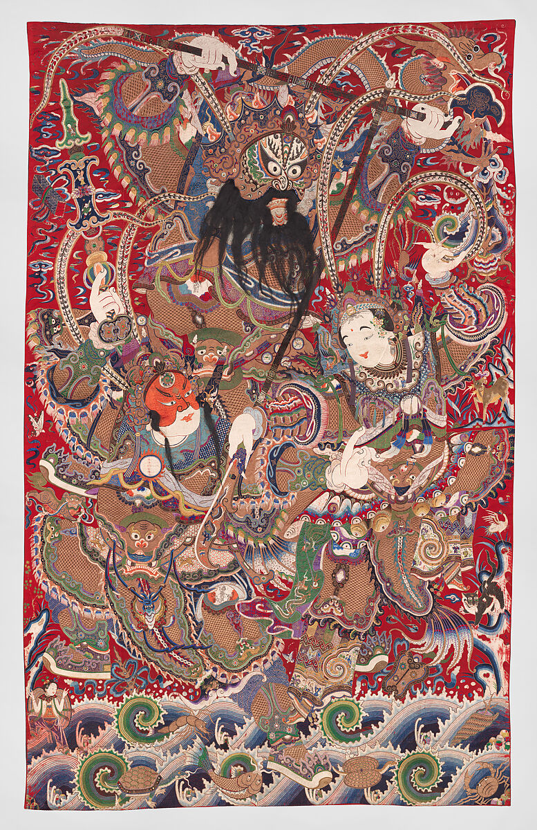 This wall hanging depicts a battle scene from an opera. A tangle of arms, legs, weapons, and costumes fills the visual space, bringing the drama of the battle to life, and the figures, enlarged to heroic scale, tower over the viewer. The textile makers used animal hair for the middle figure’s beard to add texture and three-dimensionality to the work. This banner might have hung on a stage to provide a background setting for an opera production, or perhaps it decorated another part of a theater.