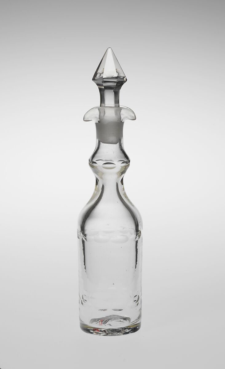 This cruet bottle is one of a set of six, 1972.225.2–.7, that belongs with the silver cruet stand, 1972.225.1. Although the stand is of American make, these bottles were probably imported from England or Ireland.