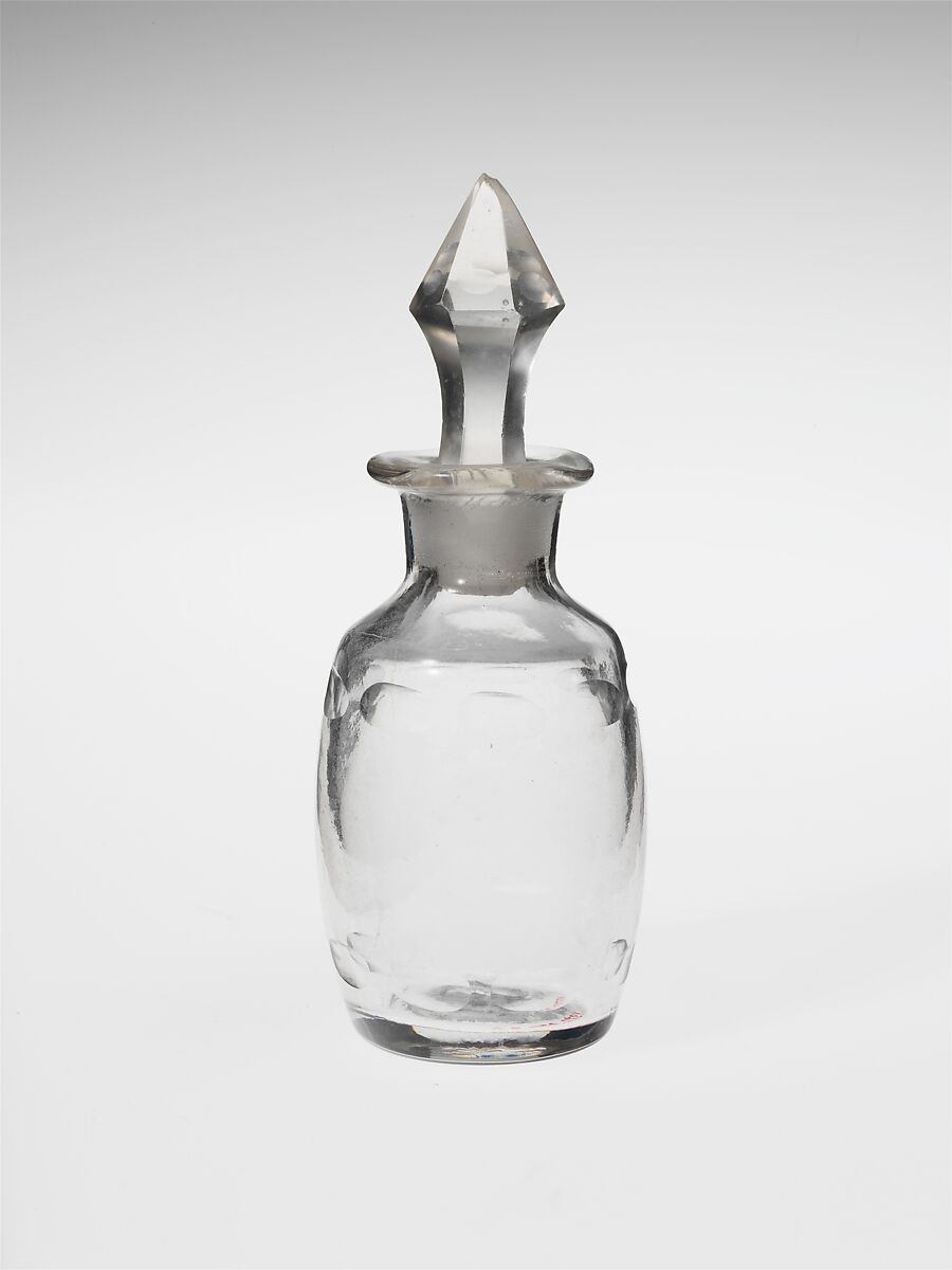 This cruet bottle is one of a set of six, 1972.225.2–.7, that belongs with the silver cruet stand, 1972.225.1. Although the stand is of American make, these bottles were probably imported from England or Ireland.