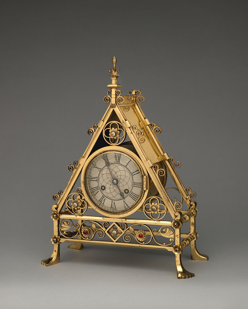 By the nineteenth century, advances in manufacturing meant timekeeping was no longer a luxury but something accessible to the growing middle class. Bruce J. Talbert was a successful commercial designer known for his work in the Gothic Revival style, including furniture, textiles, metalwork, and stained glass. Blending historicized imagery with modern manufacturing, this clock made for middle-class consumption speaks to the Victorian celebration of what was perceived as Britain’s “own” Gothic style.