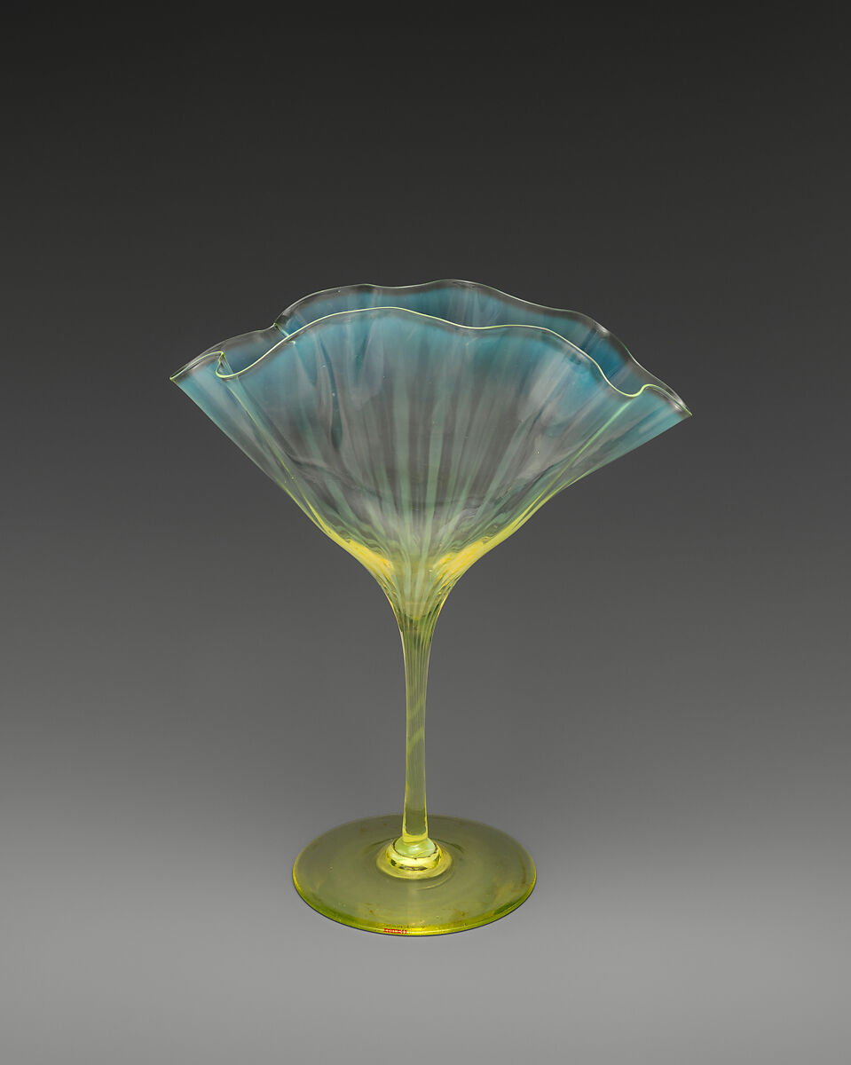 This object is a very fine example of the series of vases designed by Harry Powell (grandson of the wine-merchant, James Powell, who had purchased the Whitefriars Glassworks in 1834). Harry Powell’s designs of the 1880s and ‘90s created a whole group of decorative vessels characterized by delicately irregular wavy-rimmed bowls and subtly tinted glass. The fineness of the glass, accentuated by the ruffles of the bowl, is inspired by Venetian cristallo. The fluid design of the delicately irregular, fan-shaped bowl is testament to the skill of the Whitefriars’ glassmakers and to Powell’s confidence in their craftsmanship, achieved by holding the partially-shaped molten glass upside down on the blowpipe and swinging it out to create the natural form rather than by more conventionally manually manipulating the glass with a crimping tool. In this, this piece exemplifies the core philosophy of James Powell & Sons to prize glassmakers’ technique and celebrate the colors and property of their material, rather than to simply depend upon surface decoration and embellishment. At the opposite end of their spectrum of production, James Powell & Sons also used the colors and format of this group of vases’ bowl designs to great and influential effect in more functional glassware as the bowls for oil lamps.