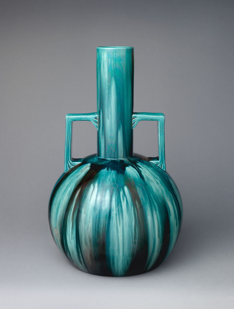 This vase is one of the largest works that Christopher Dresser created for the Ault Pottery, the ceramic firm to which Dresser supplied designs at the end of his career. Before working with Ault, Dresser supplied designs to the Linthorpe Pottery, and Dresser’s Linthorpe ceramics are the best known of his production in this medium. However, Dresser’s best work for Ault rivals that made at Linthorpe.