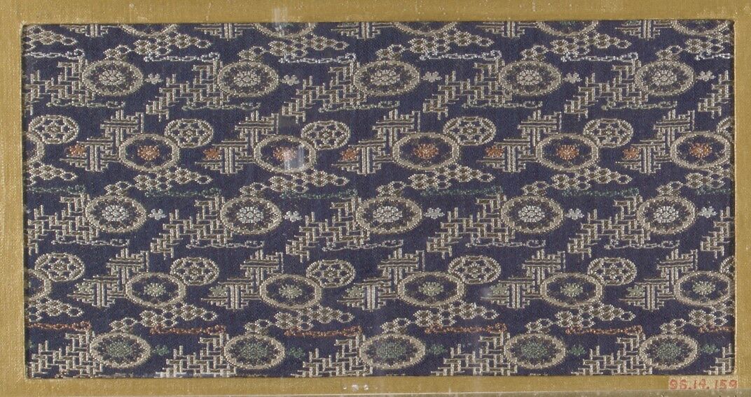 - Title: Textile fragment with repeating pattern of scattered oval medallions and diaper patterns