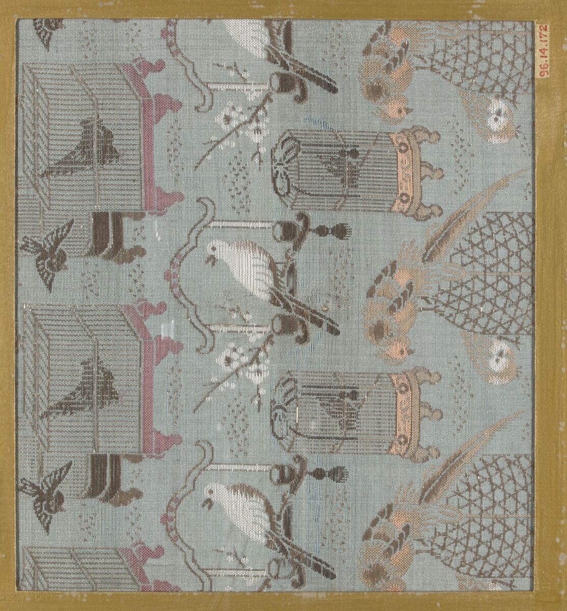 Textile fragment with incomplete repeating pattern of birds and bird cages