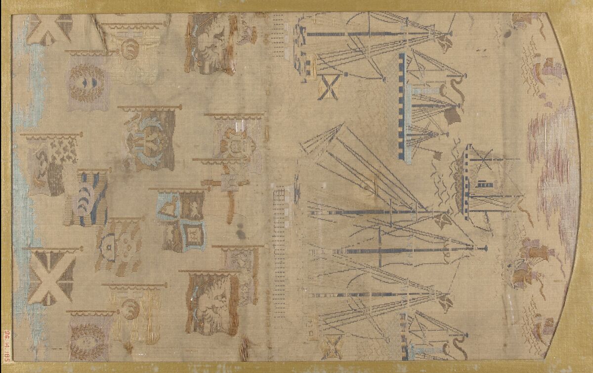 - Title: Textile fragment with pattern of ships and flags