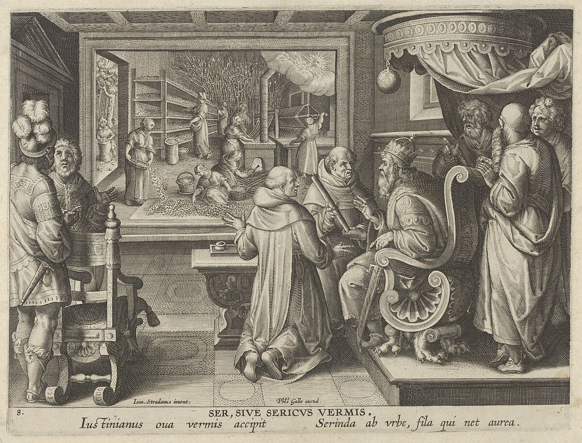 Eighth plate from a print series entitled Nova Reperta (New Inventions of Modern Times) consisting of a title page and 19 plates, engraved by Jan Collaert I, after Jan van der Straet, called Stradanus, and published by Philips Galle. Illustration of the production of silk. In the background women are performing various procedures for the making of silk. In the foreground, in a room separated from the production site, several men converse with a king seated upon his throne.