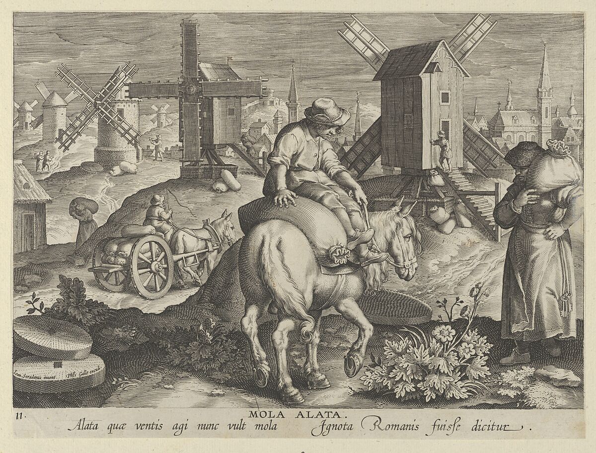 Eleventh plate from a print series entitled Nova Reperta (New Inventions of Modern Times) consisting of a title page and 19 plates, engraved by Jan Collaert I, after Jan van der Straet, called Stradanus, and published by Philips Galle. Illustration of several wind mills in a landscape. A town with its churches is depicted in the background on the right. In the middle ground a woman carries a sack on her back, a man drives a horse-drawn carriage with more sacks, and a man draws a sack down from the top of a wind mill. In the foreground a man carries a sack on horseback, while a woman carries another one on her back.