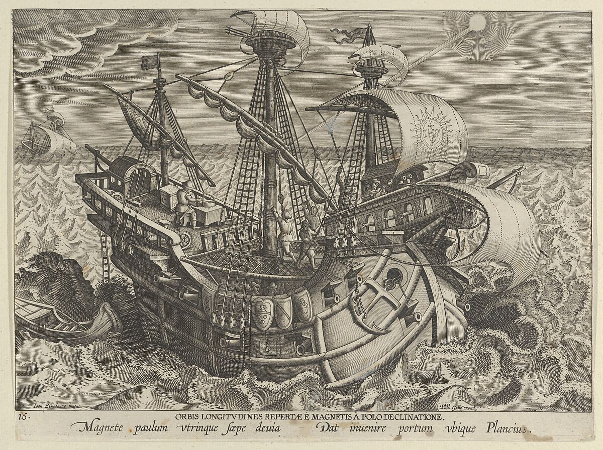 Sixteenth plate from a print series entitled Nova Reperta (New Inventions of Modern Times) consisting of a title page and 19 plates, engraved by Jan Collaert I, after Jan van der Straet, called Stradanus, and published by Philips Galle. Illustration of a ship sailing on the ocean. At the back of the ship a man examines the ship's longitudinal placement on the globe. Toward the front of the ship are other sailors who hoist the flags, one of which is inscribed with the sign "IHS."