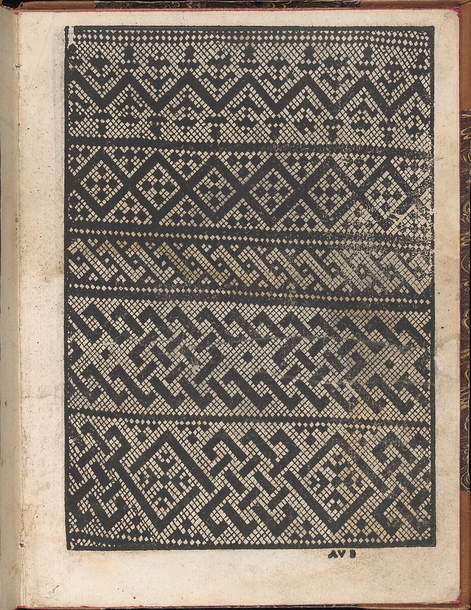 Design composed of 5 horizontal registers. First register is decorated with a wavy line with flowers placed at each point. Second register is decorated with a line of diamonds containing a '+' made of 5 smaller diamonds. Third register is decorated with 2 intertwining lines. Fourth register is decorated with an interlace pattern. Fifth register is decorated with an alternating pattern of an interlace motif and diamond.
