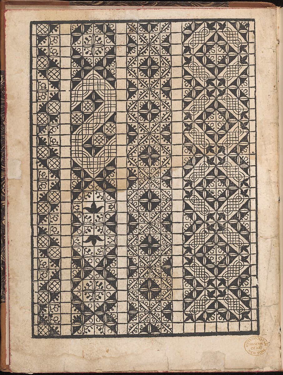 Design composed of 4 vertical columns of an akin pattern. First 3 columns end in an ornamental motif: an 8-pointed star, vase with a flower, and a pair of shaking hands with a cross below. The fourth pattern continues from the top edge all the way to the bottom edge.