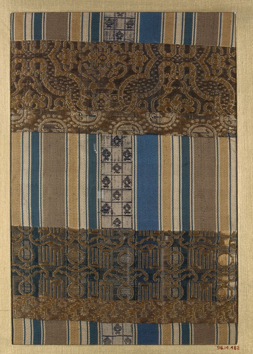 - Title:Textile fragment with repeating pattern of stripes and figured bands