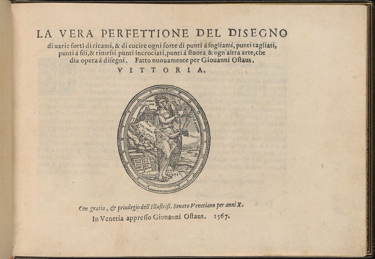 - Title: La Vera Perfettione del Disegno di varie sorti di recami, title page (recto)