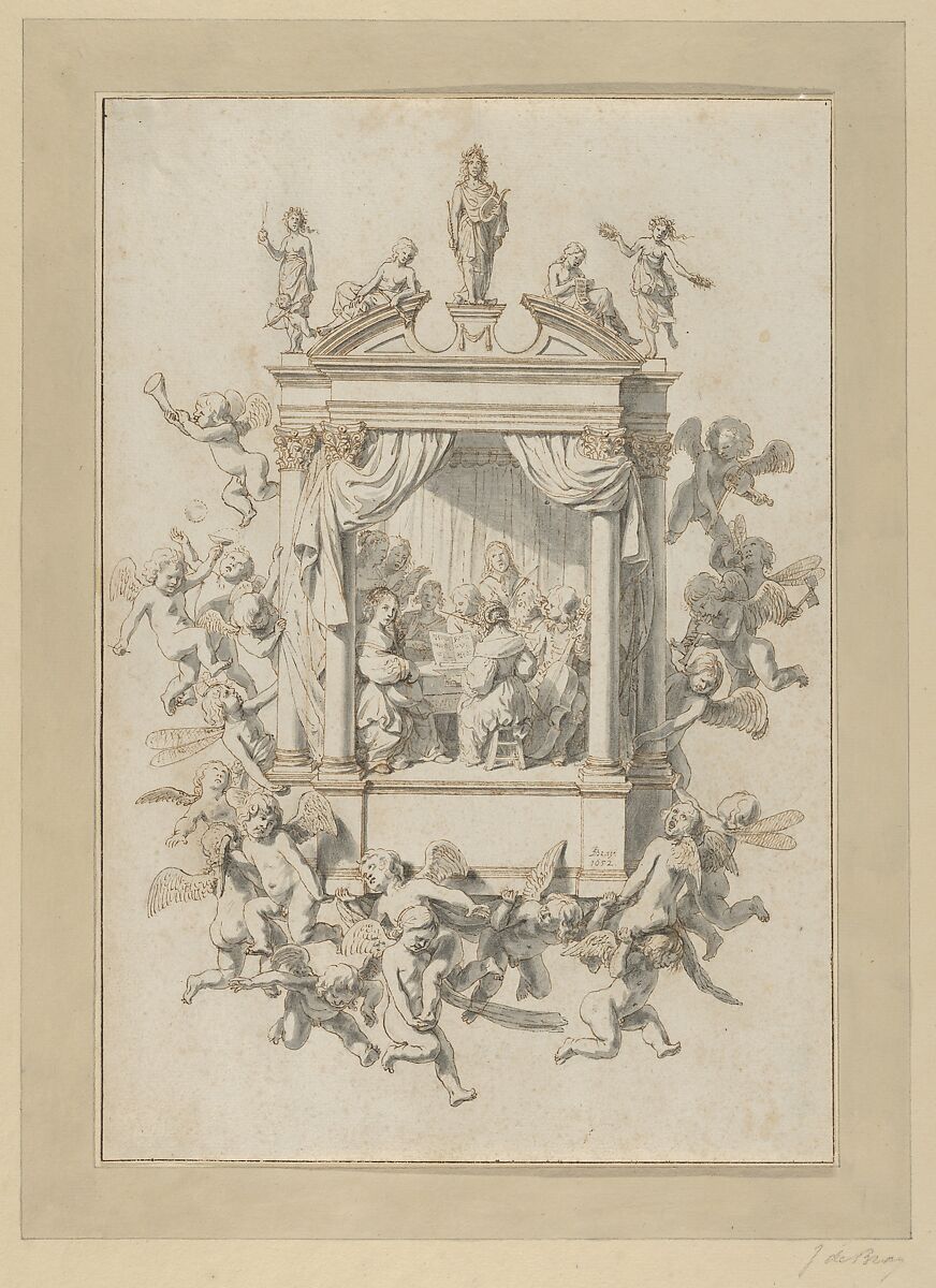 This drawing presents within a classical portico a group of fashionable men and women singing and playing musical instruments, among them a clavichord, double-headed lute, and cello. Atop the portico are Apollo with his lyre and four female figures: one, probably Venus, holds a flaming heart and is accompanied by Cupid (a reference to the longstanding association of music and love); the other three (possibly classical muses) hold a horn, read sheet music, and dance, respectively. The entire structure is surrounded and (with evident effort) supported by putti, some of whom also play music, while others occupy themselves with a soap bubble, at left, and, at right, a windmill. These motifs may simply allude to music as an inherently fleeting pleasure.