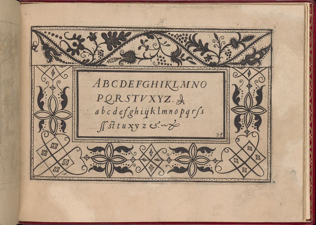 Design is composed of a central rectangle upon which the alphabet is printed twice. Surrounding all sides of the middle section is a border decorated with various foliage and floral elements as well as geometric motifs.