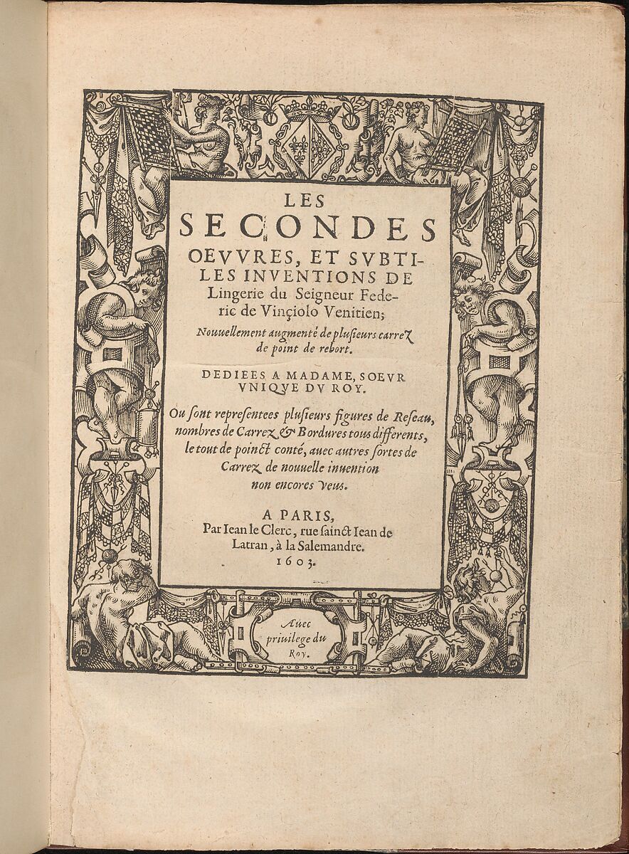 - Title: Les Secondes Oeuvres, et Subtiles Inventions De Lingerie du Seigneur Federic de Vinciolo Venitien, title page (recto)