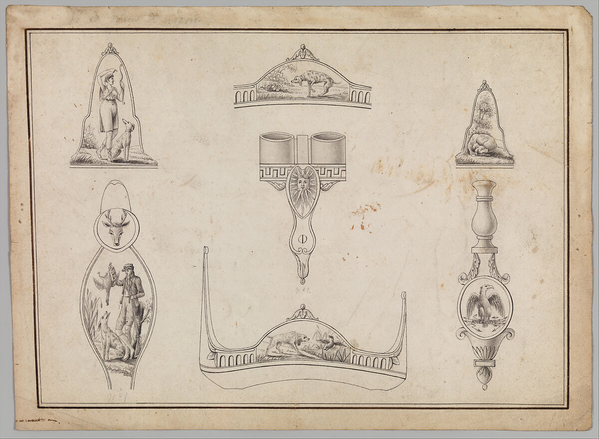 These seven designs are original studies made by the inventor and naturalist Jean-Francois Lucas for a pattern book of firearms ornament in the neoclassical or Empire style. The twenty-two total sheets comprising this pattern book were issued in installments between 1807 and 1808. The signed sheets were executed by two little-known engravers, Rennesson, who did the majority, and Ruhierre (possibly Edme Jean Ruhierre, born 1789).