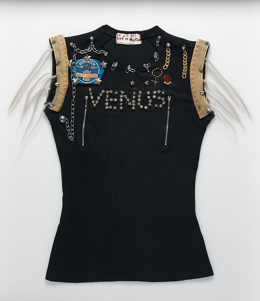 Widely regarded as the most important British fashion designer of the twentieth century, Vivienne Westwood began her career in collaboration with Malcolm McLaren. The duo opened a London boutique in 1971, designing, producing, and merchandising their clothing with hands-on practices that exemplified the DIY ethos that would come to define the punk movement. The music-driven punk subculture, which prized ideas over beauty and action over convention, has had a unique and lasting influence on fashion. Between 1971 and 1979, Westwood and McLaren’s boutique assumed four different identities, exploring a series of looks and themes that together encapsulate the sartorial aspects of punk: bricolage, deconstruction, democracy, humor, and subversion. Among their earliest designs, the “Venus” T-shirt is a stylistic harbinger of punk and an exceptionally rare artifact. Although few examples were produced, Westwood wore the piece prominently, investing it with enduring iconographic value.
