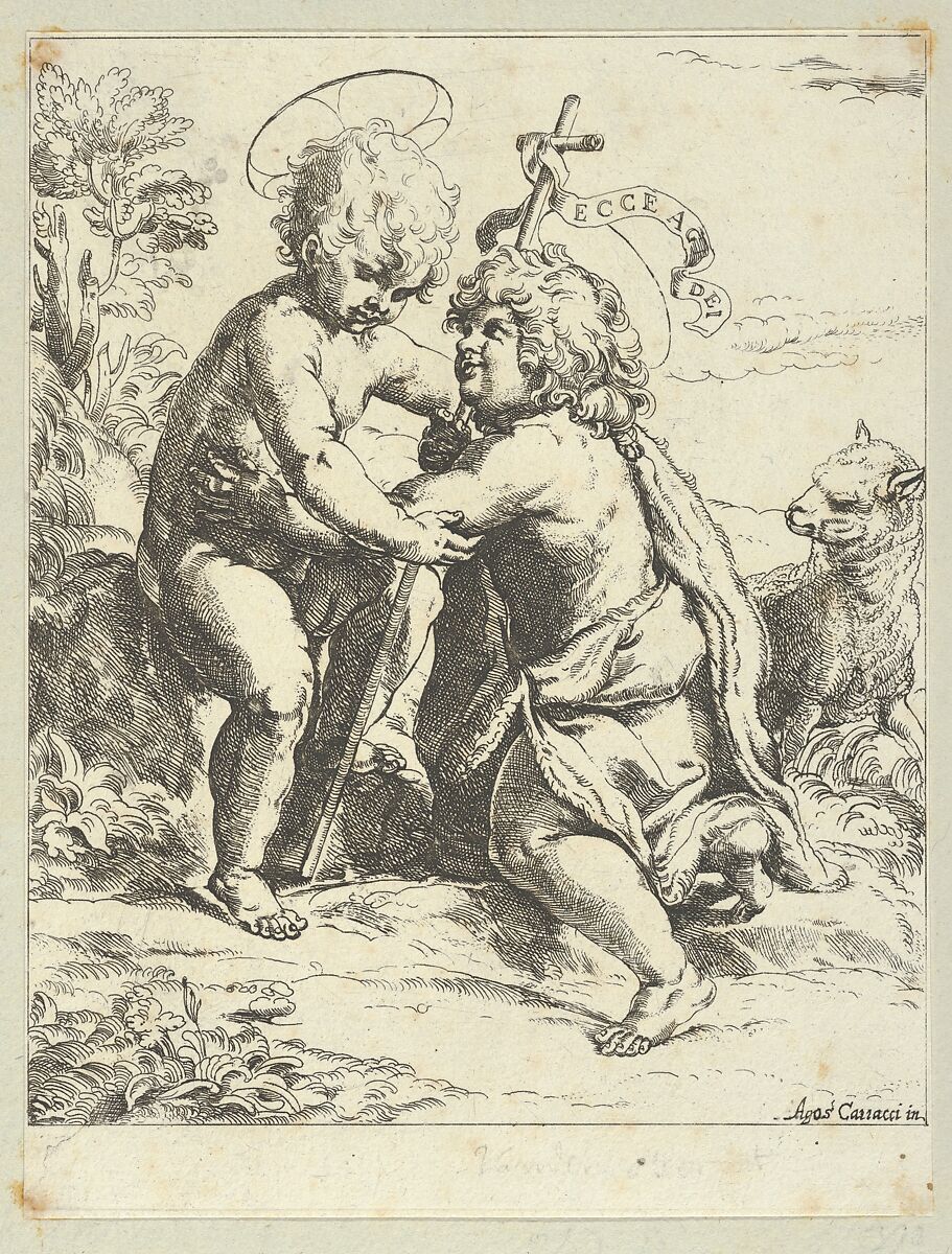 - Title: The young Saint John the Baptist kneeling before the young Christ who embraces him, a lamb at right, after Reni