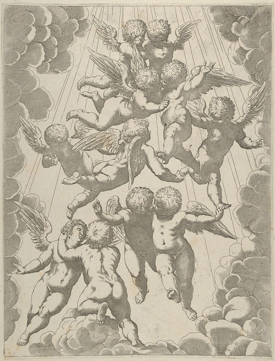 - Title:A group of angels embracing in flight, framed by clouds, after Reni