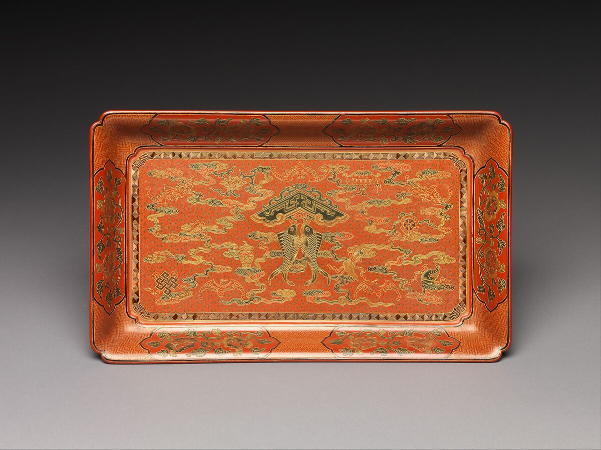 The two fish on this tray are suspended from a pendant in the shape of an ancient stone chime, which represents wishes for happiness and abundance (yuqing). The twin fish is also one of the eight Buddhist treasures—the other seven are arranged in the foreground: a wheel, conch shell, umbrella, parasol, flower, jar, and double knot. Shown with bats and clouds, these symbols convey auspicious wishes beyond religious meaning.