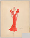 Drawing, design for a woman's costume, part of a group of 88 costume designs by Vincente Minnelli. The costume consists of a red vest with white polka dots and large, flared cap sleeves over a high-neck, white blouse, a matching red skirt with white polka dots, figure-hugging at the hips and flared at the bottom, and a red belt with a white oval buckle. The hair is short, wavy and platinum blonde, held back by a red headband; the shoes are white, with pointed toes and high heels.