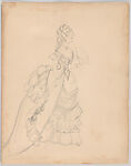 Drawing, study of a woman's costume, part of a group of 88 costume designs by Vincente Minnelli. The design consists of a Victorian ball gown with ruffles and floral details. The female figure represented wearing the dress has her hair up, adorned with a tiara, and holds a fan in her left hand. A necklace with a medallion hangs around her neck. Notes from Vincente Minnelli in 1978 specify that this costume was created for the production 'Ziegfeld Follies [of 1936].'