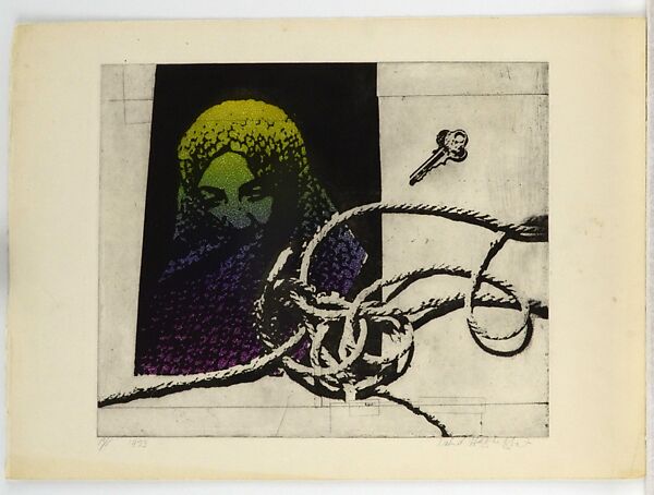 Nahid Hagigat’s prints give insight into the conditions of women in Iran during the years leading up to the Revolution. This photo-etching incorporates elements that evoke the climate of repression and suspicion that permeated society in the mid-1970s: a rope, a key, and a woman set against a dark background. In the late 1960s, Hagigat had studied printmaking in New York, and continued using it upon her return to Iran in the early 1970s. A relatively unknown medium in Iran, printmaking became the ideal mode for Hagigat to express her politically charged messages.