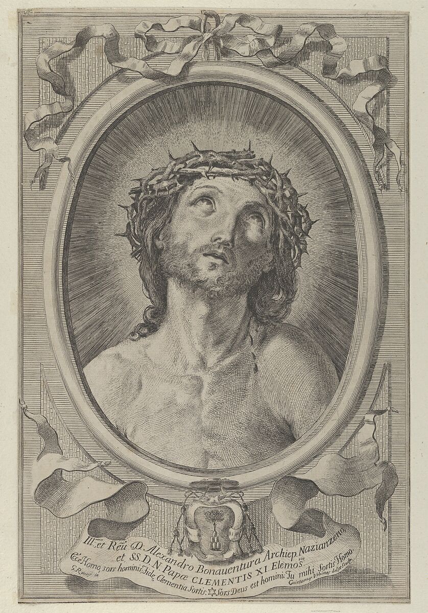 • Title: Head of Christ with crown of thorns, in an oval frame with a ribbon above and banderole below, after Reni