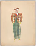 Drawing, design for a man's costume, part of a group of 88 costume designs by Vincente Minnelli. The costume consists of a brown plaid jacket ovwer a white shirt with red tie and brown plaid waistcoat, and high-waisted, green plaid trousers, worn with a brown plaid beret and yellow gloves and pointed-toe shoes.