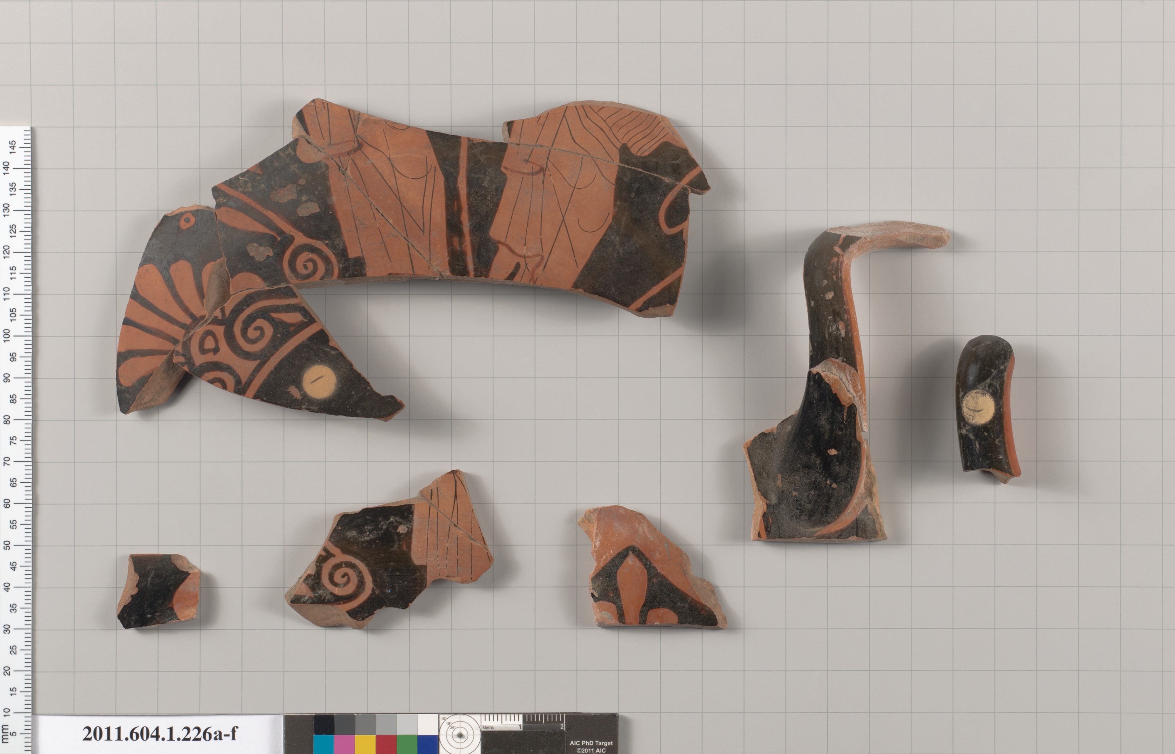 Interior, drapery of standing figure; Exterior, handle palmette, draped figure with a stick, draped figure holding a fillet; stick from a third figure; Left half of handle with palmette, handle fragment, tendril and drapery, black glaze rim fragment