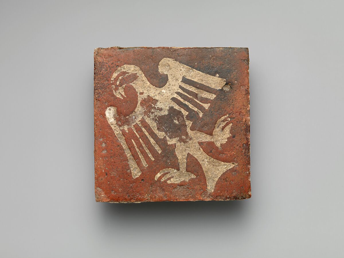 This encaustic tile with an eagle on the diagonal came from the church of Saint Ethelreda at West Quantoxhead, Somerset.