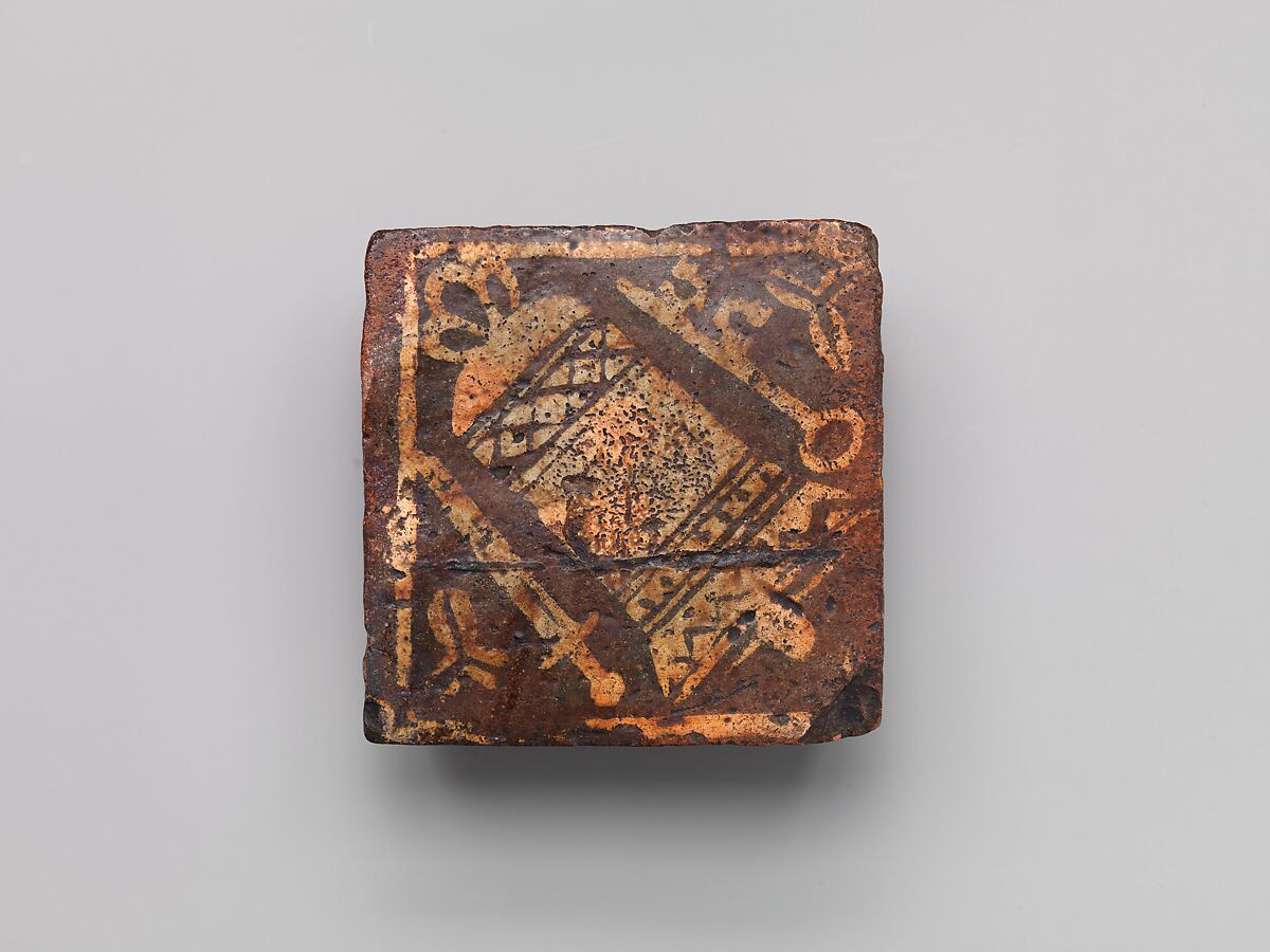This square tile is decorated in encaustic with a bell flanked by a sword and a key, all on the diagonal, and the whole of the design enclosed with a line border.