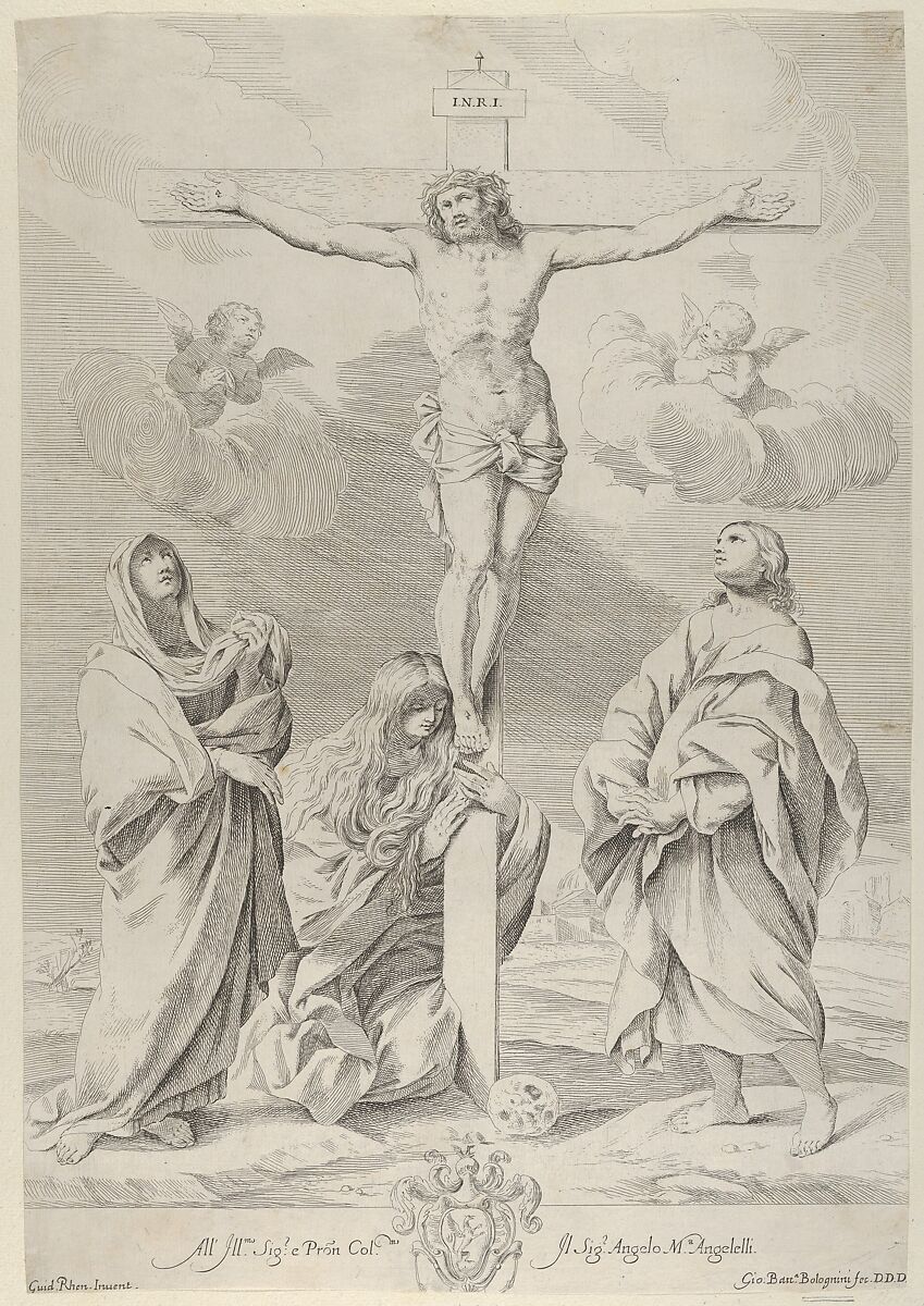 - Title: Christ on the cross, Saint John the Baptist at right, Mary Magdelene and the Virgin at left, after Reni