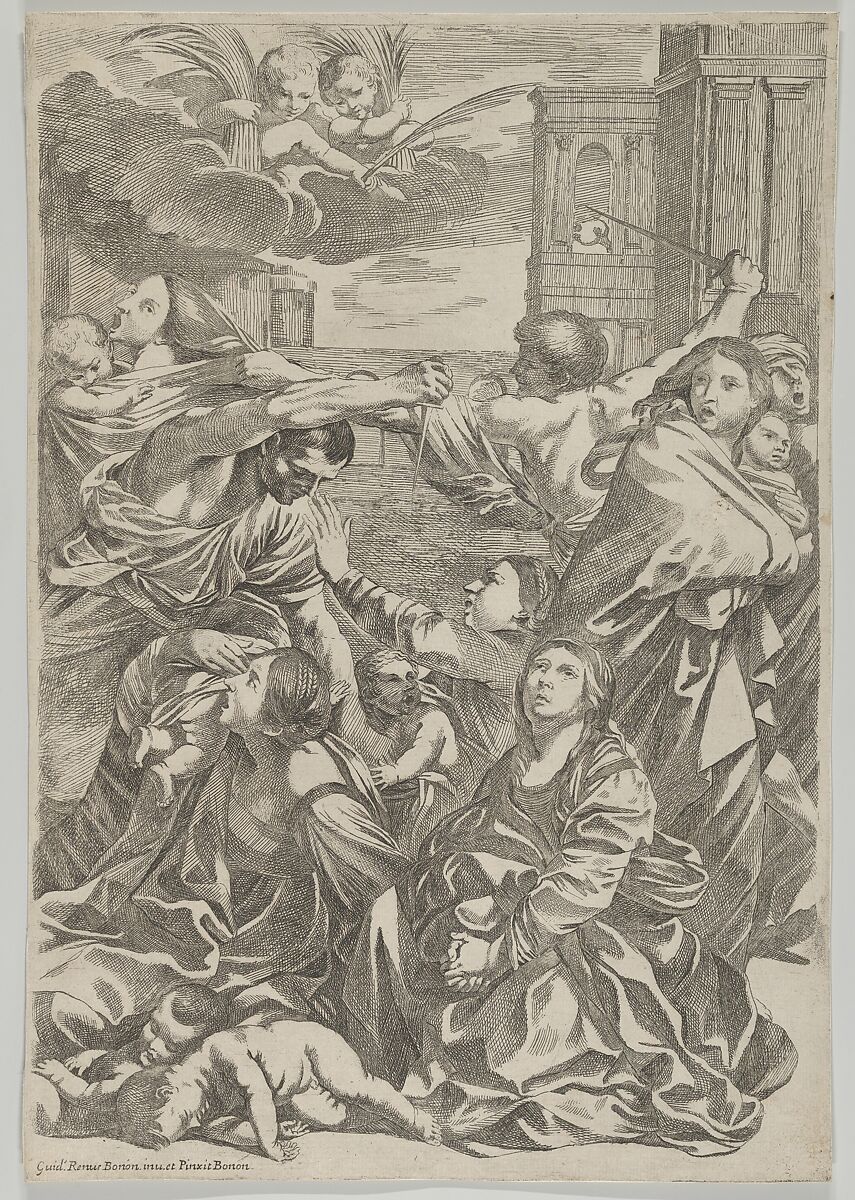 - Title: Massacre of the Innocents; group of women and children being attacked, two angels at upper left, after Reni