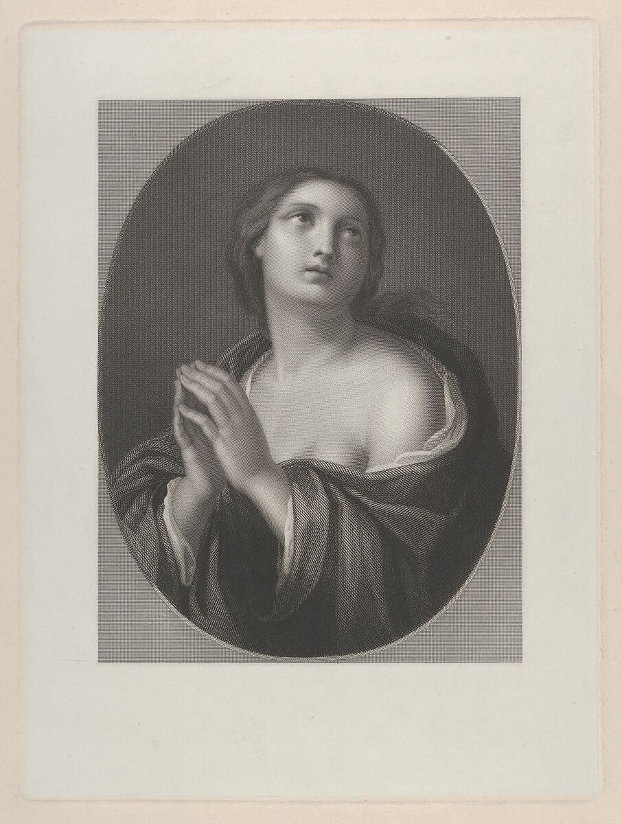 - Title: Female personification of Hope looking up with hands held together and left shoulder exposed, in an oval frame, after Reni