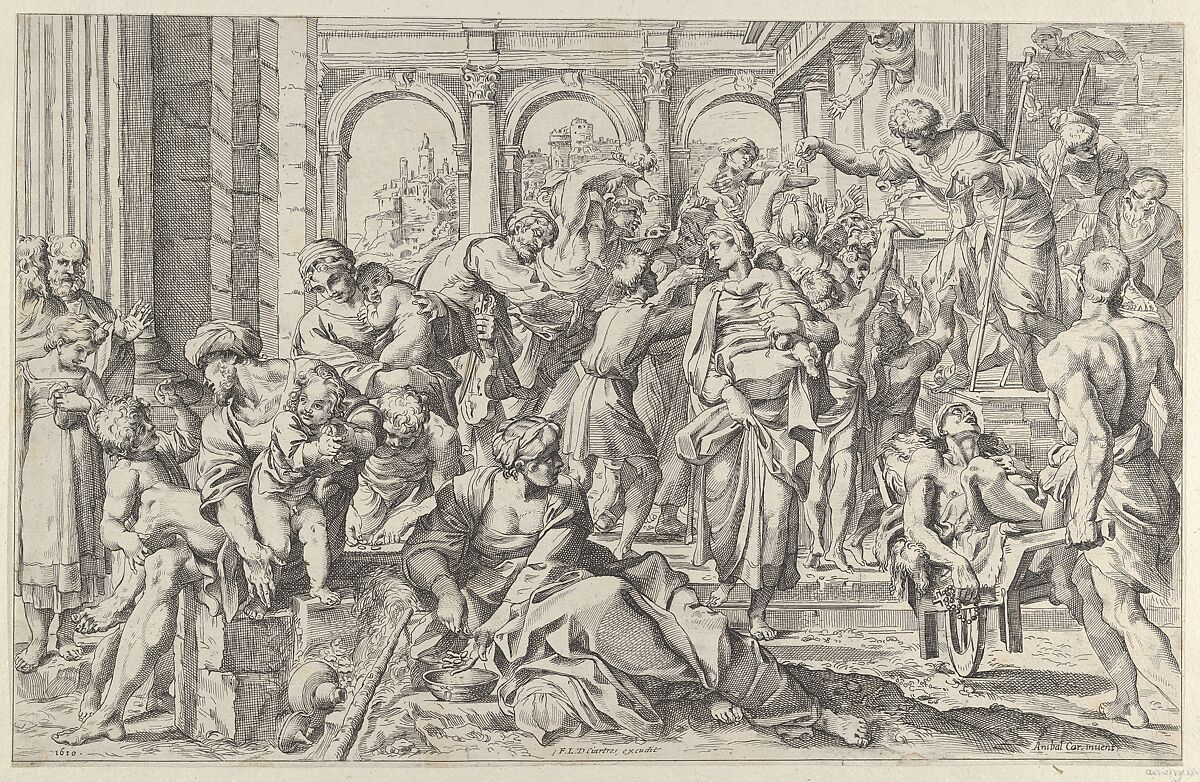 Saint Roch at right distributing alms to a group of people gathered around him, after Annibale Caracci
