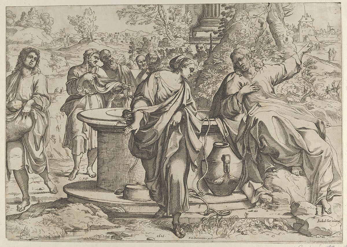- Title:The Samaritan woman standing at the well, Christ seated next to her pointing to the right, after Annibale Caracci